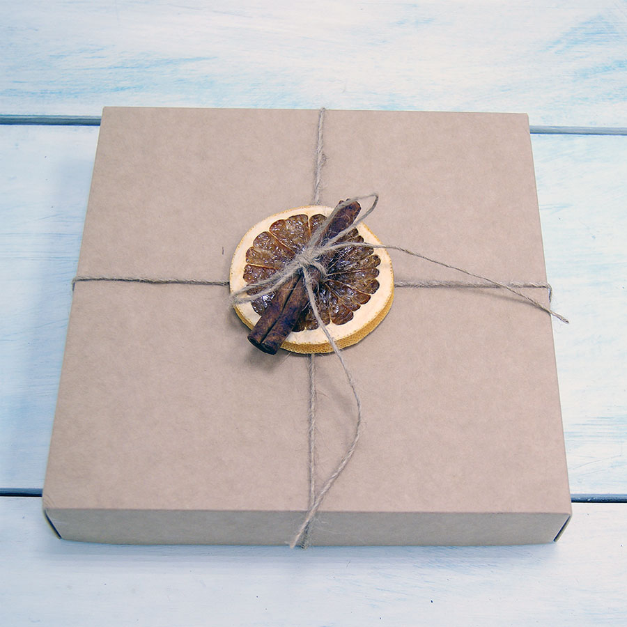 - Коробка из картона, декорированная сушеным грейпфрутом и палочкой корицы c наполнителем.