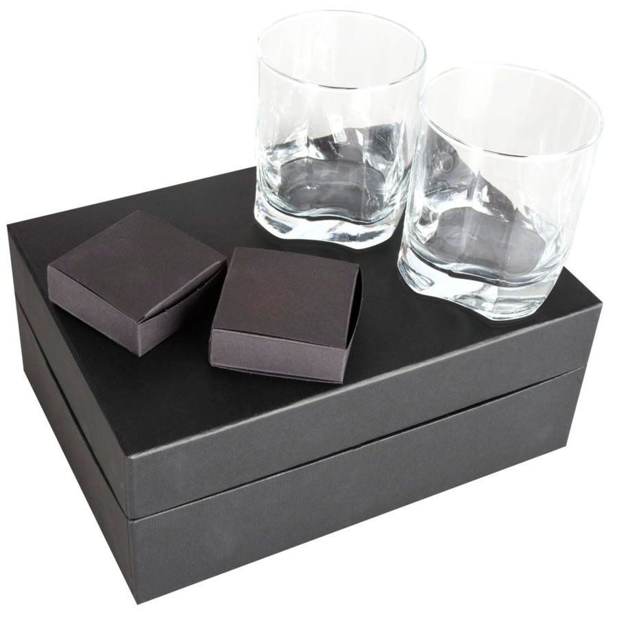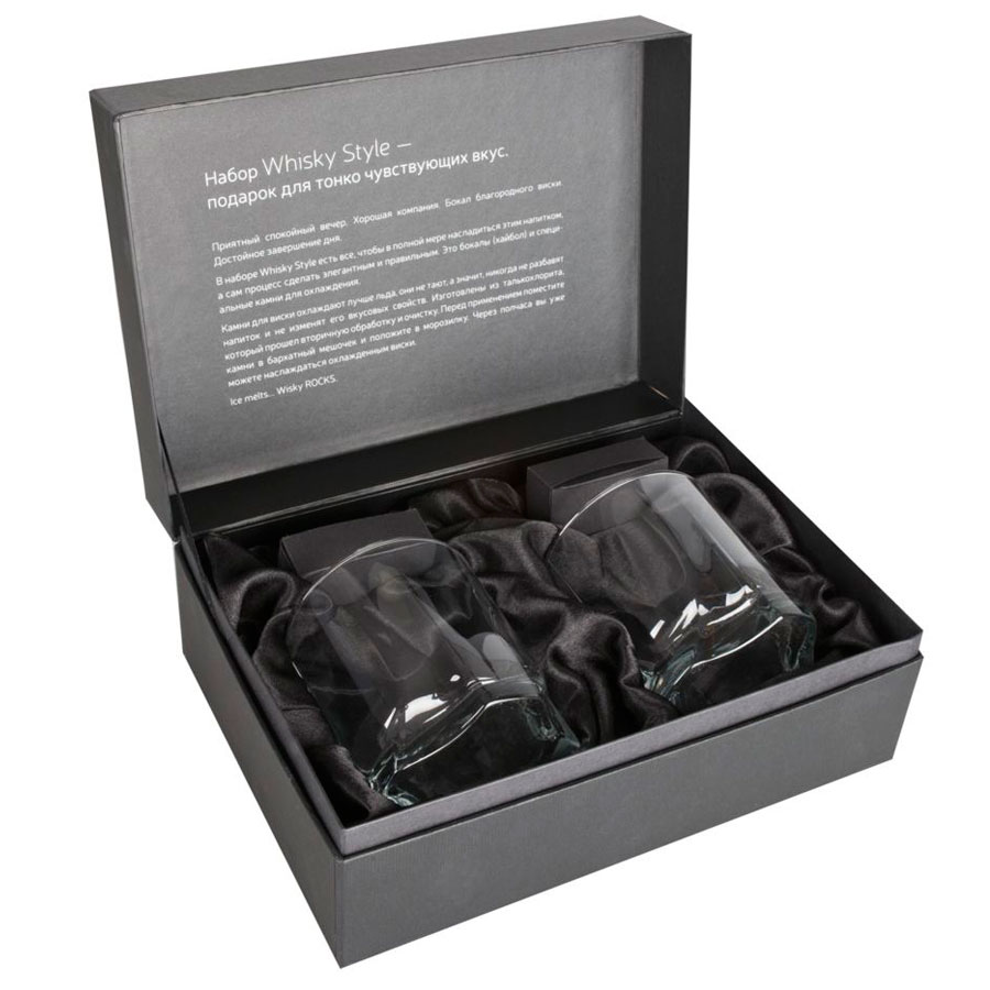 В набор входит 2 бокала объемом 360 мл каждый, 9 камней для охлаждения напитка, бархатный мешок для удобного хранения в морозилке, подарочная коробка.