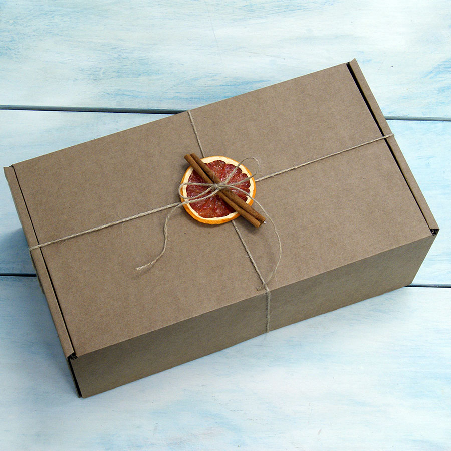 - Коробка из картона, декорированная сушеным апельсином и палочкой корицы c наполнителем.